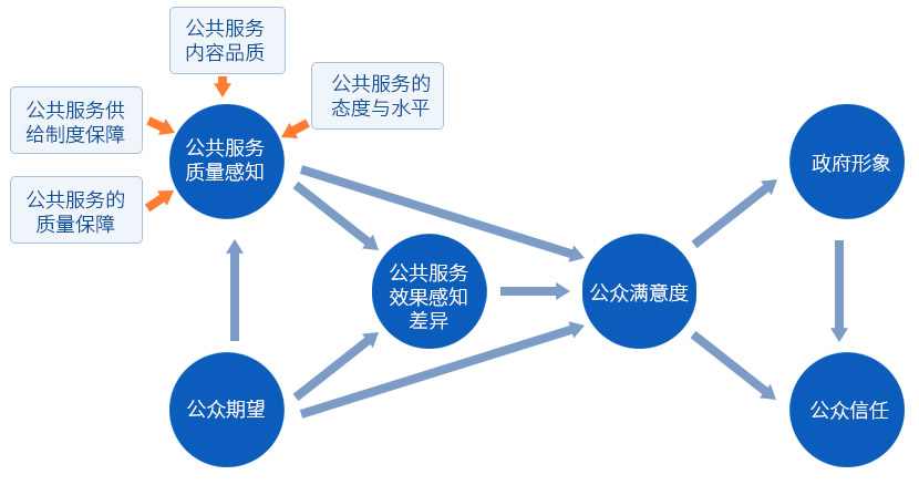 公共服務研究主要內容為公共服務滿意度測評,公共服務滿意度源于公眾在接受公共服務過程中對接受的服務績效的感知。影響公眾對公共質量感知因素主要有服務過程、內容、態度與水平、效果等因素。通過對這些因素的分析可以比較公眾預期質量與感知質量之間的差異,即公共服務效果感知差異,從而得出公眾滿意度。
